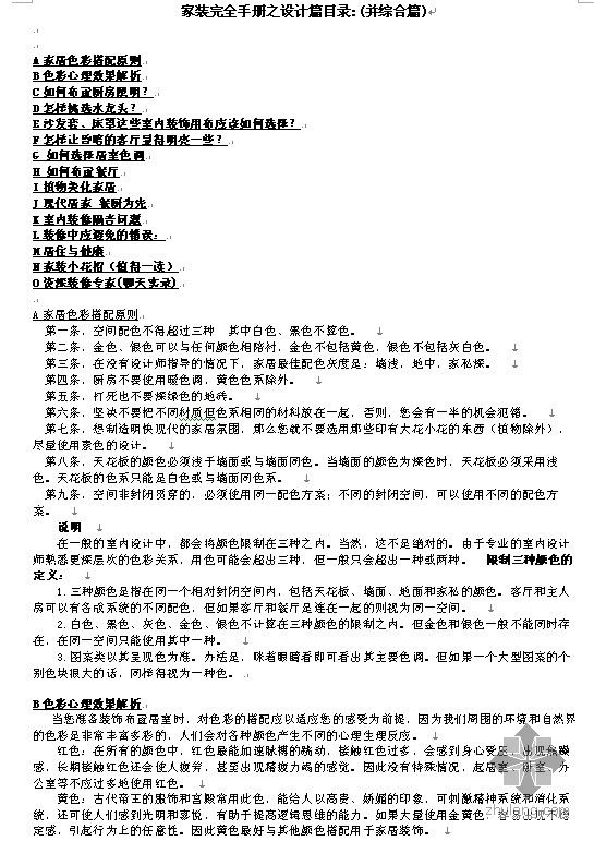 家装完全设计手册-设计篇,共36页。 A家居色彩搭配原则 B色彩心理效果解析 C如何布置厨房照明? D怎样挑选水龙头? E沙发套、床罩这些室内装饰用布应该如何选择? F怎样让昏暗的客厅显得明亮一些?...